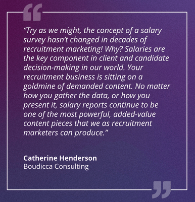 “Try as we might, the concept of a salary survey hasn’t changed in decades of recruitment marketing! Why? Salaries are the key component in client and candidate decision-making in our world. Your recruitment business is sitting on a goldmine of demanded content. No matter how you gather the data, or how you present it, salary reports continue to be one of the most powerful, added-value content pieces that we as recruitment marketers can produce.”