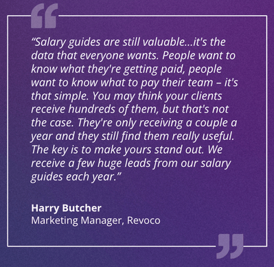 “Salary guides are still valuable…it’s the data that everyone wants. People want to know what they’re getting paid, people want to know what to pay their team - it’s that simple. You may think your clients receive hundreds of them, but that’s not the case. They’re only receiving a couple a year and they still find them really useful. The key is to make yours stand out. We receive a few huge leads from our salary guides each year.”