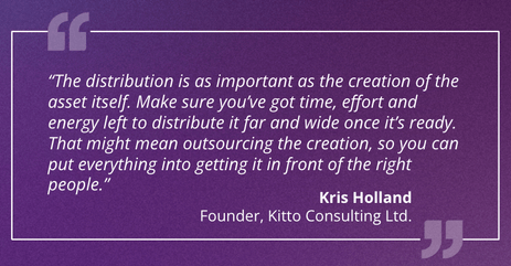 “The distribution is as important as the creation of the asset itself. Make sure you’ve got time, effort and energy left to distribute it far and wide once it’s ready. That might mean outsourcing the creation, so you can put everything into getting it in front of the right people.”