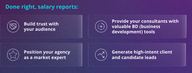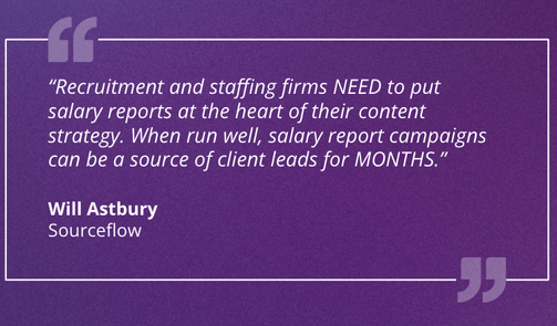“Recruitment and staffing firms NEED to put salary reports at the heart of their content strategy. When run well, salary report campaigns can be a source of client leads for MONTHS.”